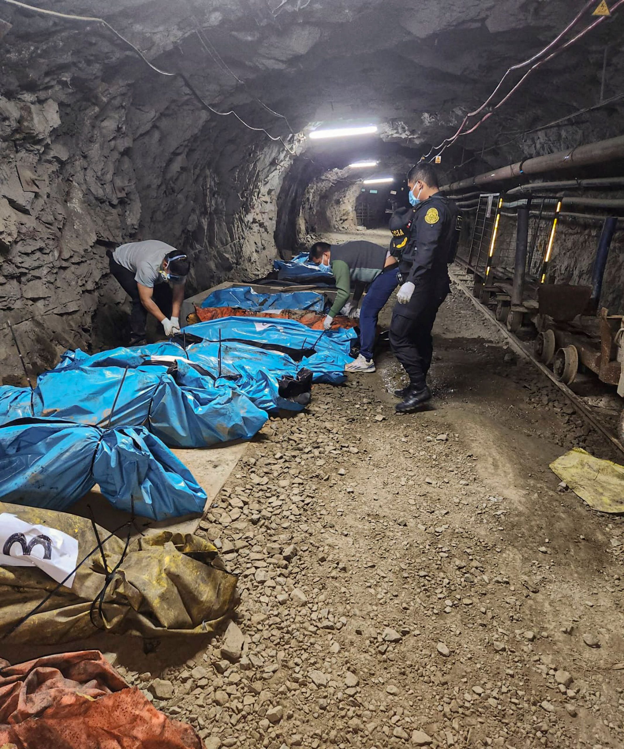 Polizeibeamte neben den Leichen von 13 Arbeitern, die tot in einer Goldmine in Pataz im Nordwesten Perus aufgefunden wurden ©AFP PHOTO / La Ibertad Police / HANDOUT