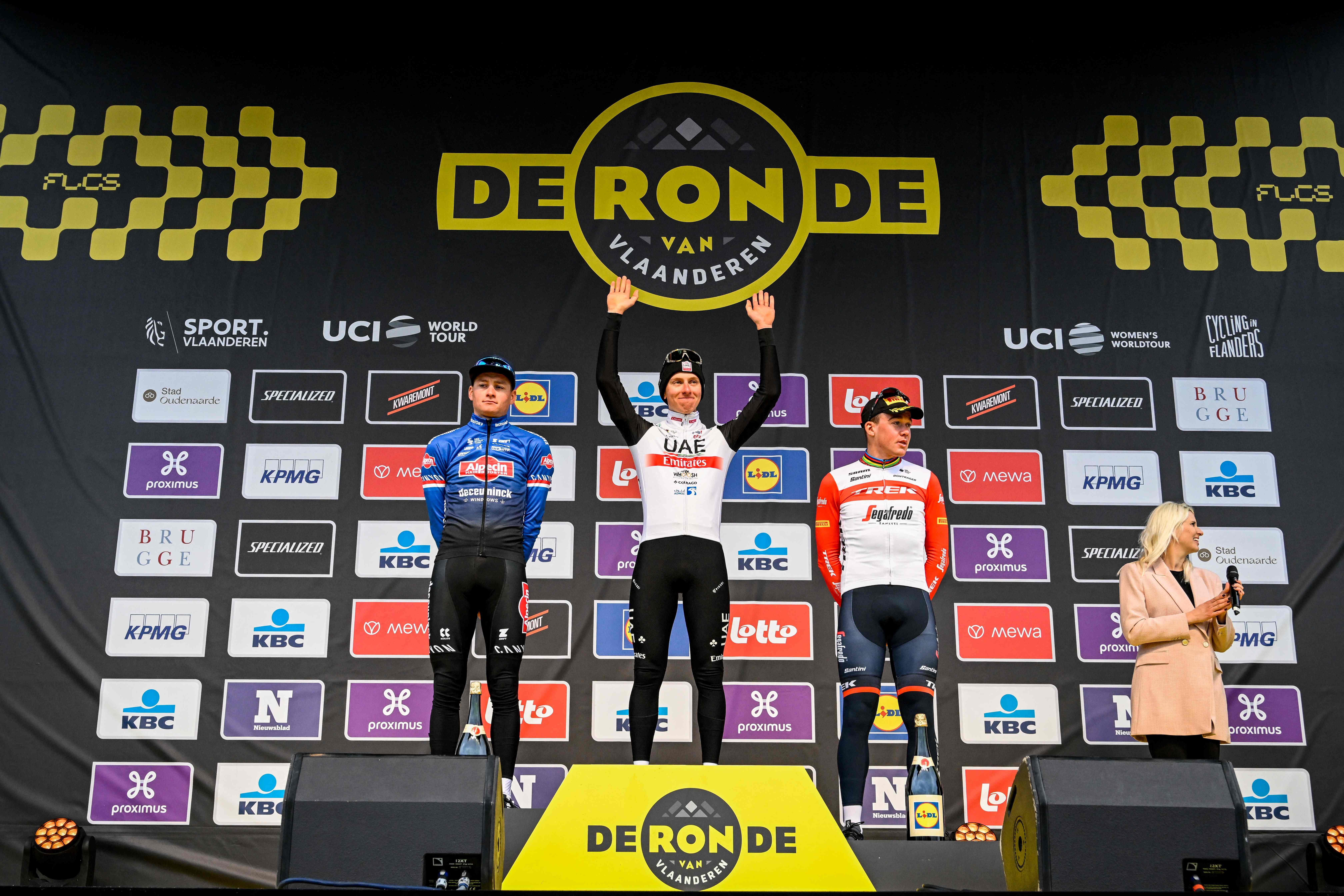 Bei der ersten Anfahrt zum Oude Kwaremont etwa 142 Kilometer vor dem Ziel geriet der Pole Filip Maciejuk bei einer Fahrbahnverengung in einen Graben. Der 23-Jährige sprang ohne Rücksicht zurück auf die Straße und räumte dabei nahezu das ganze Feld ab. Van Aert war in den Sturz ebenso verwickelt wie die Ex-Weltmeister Julian Alaphilippe (Frankreich) und Peter Sagan (Slowakei). Pogacar verlor in Tim Wellens seinen wichtigsten Helfer, der Belgier erlitt einen Schlüsselbeinbruch.
