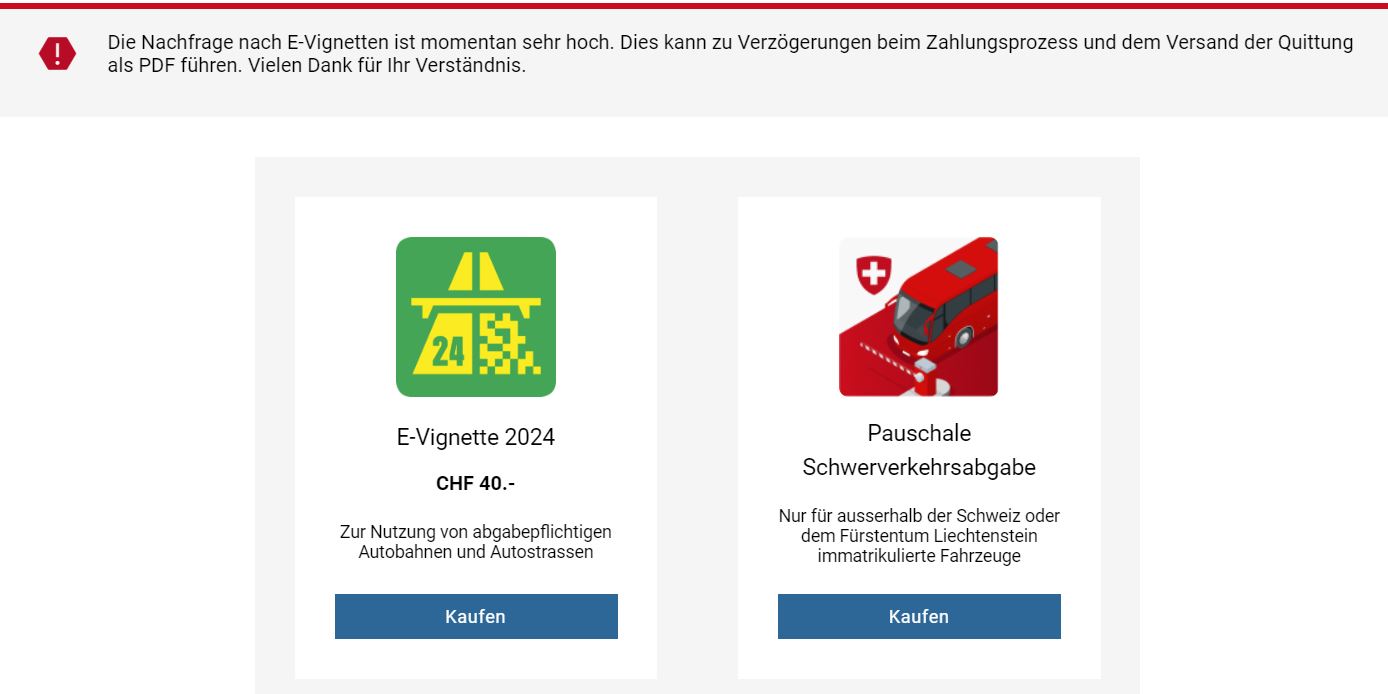 Die E-Vignette für das Jahr 2024 kann seit dem 1. Dezember 2023 erworben werden. Allerdings hat die hohe Nachfrage der Autofahrer das Online-Portal des BAZG überfordert. Innerhalb weniger Stunden nach dem Verkaufsstart wurden bereits etwa 40.000 Vignetten verkauft. Dies führte zu Verzögerungen bei der Zahlungsabwicklung und beim Versand der Kaufbestätigungen.