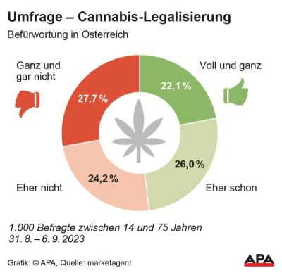 Die öffentliche Meinung sei gespalten in 48 Prozent Befürworter und 52 Prozent Gegner. Die deutsche Ampelkoalition hat Ende des Sommers eine Teillegalisierung von Cannabis für den Privatgebrauch beschlossen. Dass Österreich folgen wird, glaubt laut einer am Dienstag präsentierten Umfrage nur rund ein Drittel der Befragten. Einer knappen Mehrheit wäre das auch gar nicht recht, hat das digitale Markt- und Meinungsforschungsinstitut Marketagent erhoben.