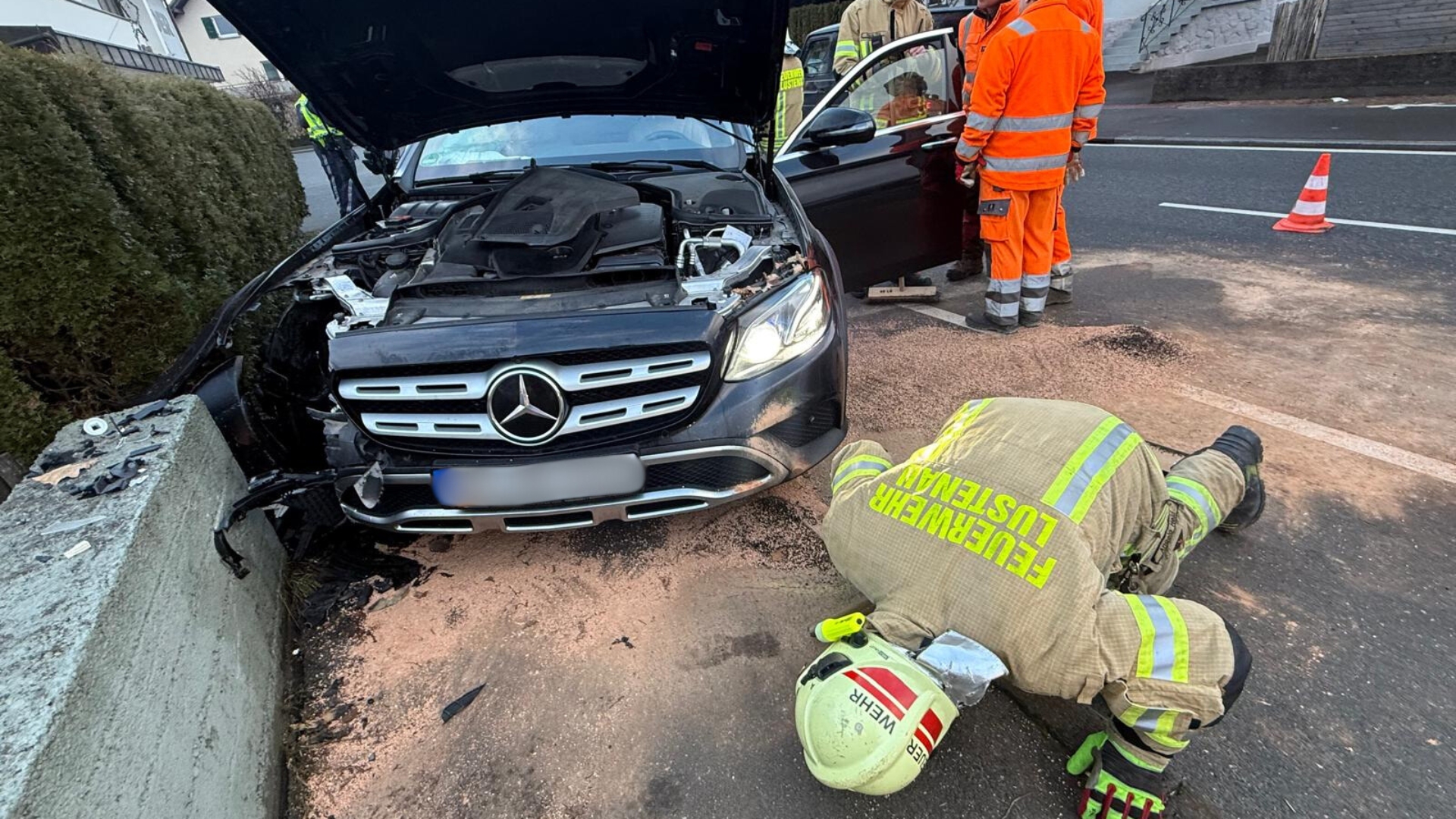 Ein Pkw der Marke Mercedes mit deutschem Kennzeichen krachte aus noch unbekannter Ursache gegen eine Gartenmauer gegenüber dem Ender Augenoptikergeschäft. Nach ersten Informationen wurden die Insassen des Pkw leicht verletzt.