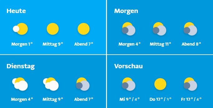 Am Dienstag schickt ein Mittelmeertief kompakte Wolken, aber keinen Niederschlag. Ausgedehnte Wolken lassen die Sonne nach Norden zu nur schwach durchkommen, im Süden ist die Sonne eher nicht zu sehen. Der Föhn lässt nach, es bleibt mild. Tiefstwerte: -1 bis +5 Grad, Höchstwerte: 8 bis 13 Grad.