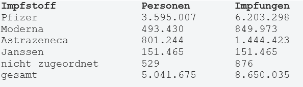 Bis inklusive Montag sind 5.041.675 Personen geimpft worden, der Großteil davon mit dem Wirkstoff von Biontech/Pfizer (3.595.007), weitere 801.244 mit Astrazenca und 493.430 mit Moderna. Der Wirkstoff von Johnson & Johnson - für ihn ist nur eine Dosis nötig - wurde an 151.465 Personen verabreicht.