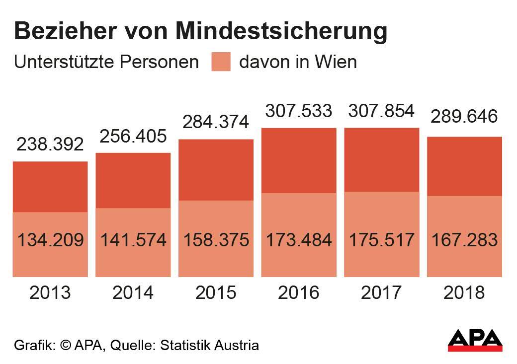 Die Zahl der Personen, die Mindestsicherung beziehen, ist im Jahr 2018 erstmals seit 2012 wieder geschrumpft. Das teilte die Statistik Austria am Freitag mit. Nach starken Zuwächsen bis 2016 und einer Stagnation im Jahr 2017 bezogen 2018 mit 289.646 Personen um 5,9 Prozent weniger Menschen die Mindestsicherung als im Jahr davor. Knapp die Hälfte aller Bezieher waren österreichische Staatsbürger.