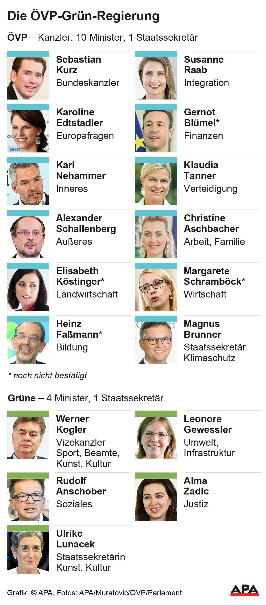 Unmittelbar nach der Angelobung ist die traditionelle Amtsübergabe der scheidenden Bundeskanzlerin Brigitte Bierlein an den neuen Kanzler Sebastian Kurz vorgesehen. Unklar ist noch, ob die türkis-grüne Regierung auch gleich ihren ersten Ministerrat abhält. Dem Vernehmen nach könnte die erste Regierungssitzung von ÖVP und Grünen nämlich erst am Mittwoch stattfinden.