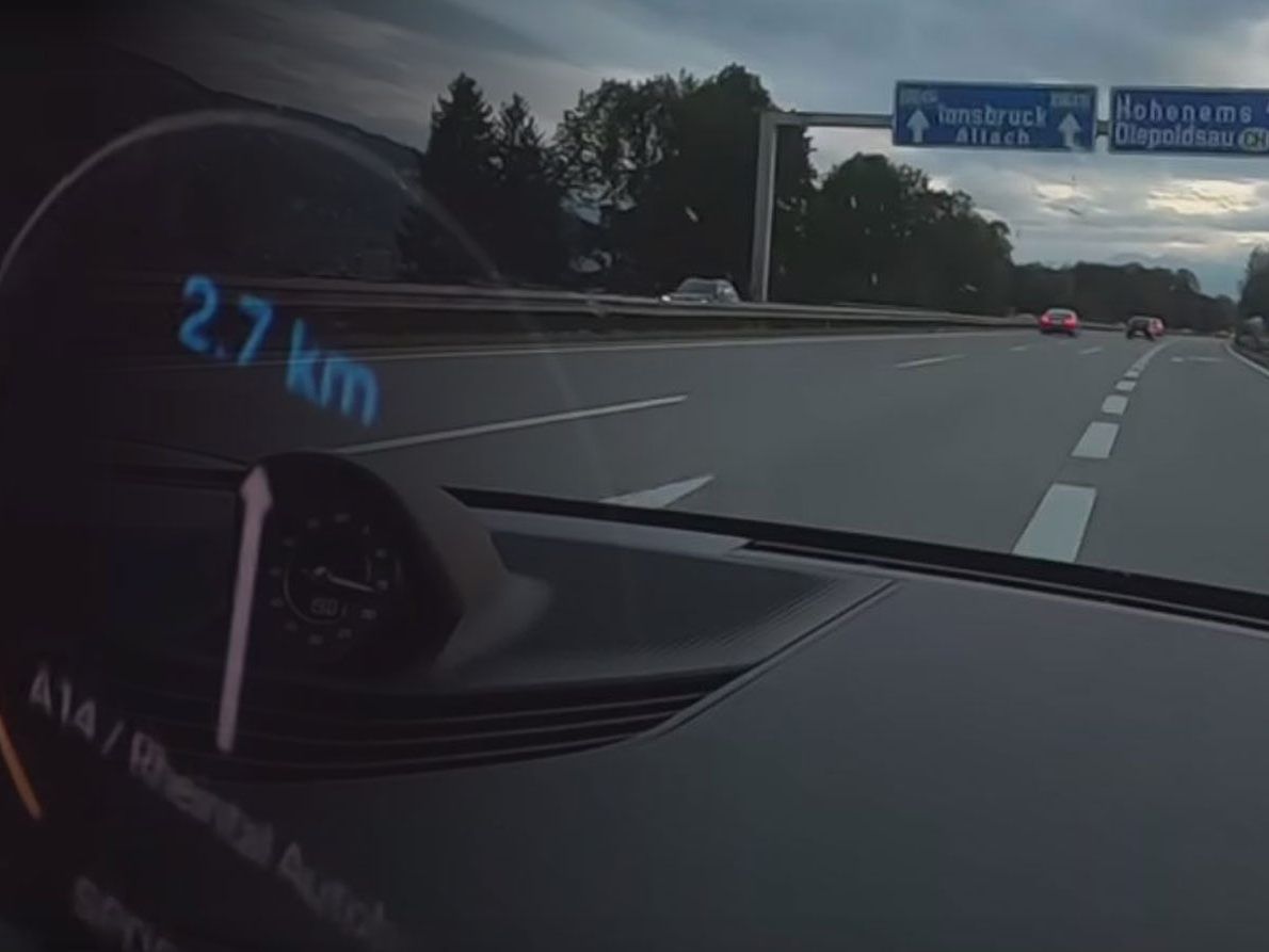Ein kurzer Kameraschwenk auf den Tacho verrät: Der Porsche ist mit irren 250 km/h hinter dem Tesla auf der A14 Rheintalautobahn zwischen Dornbirn und Hohenems unterwegs.