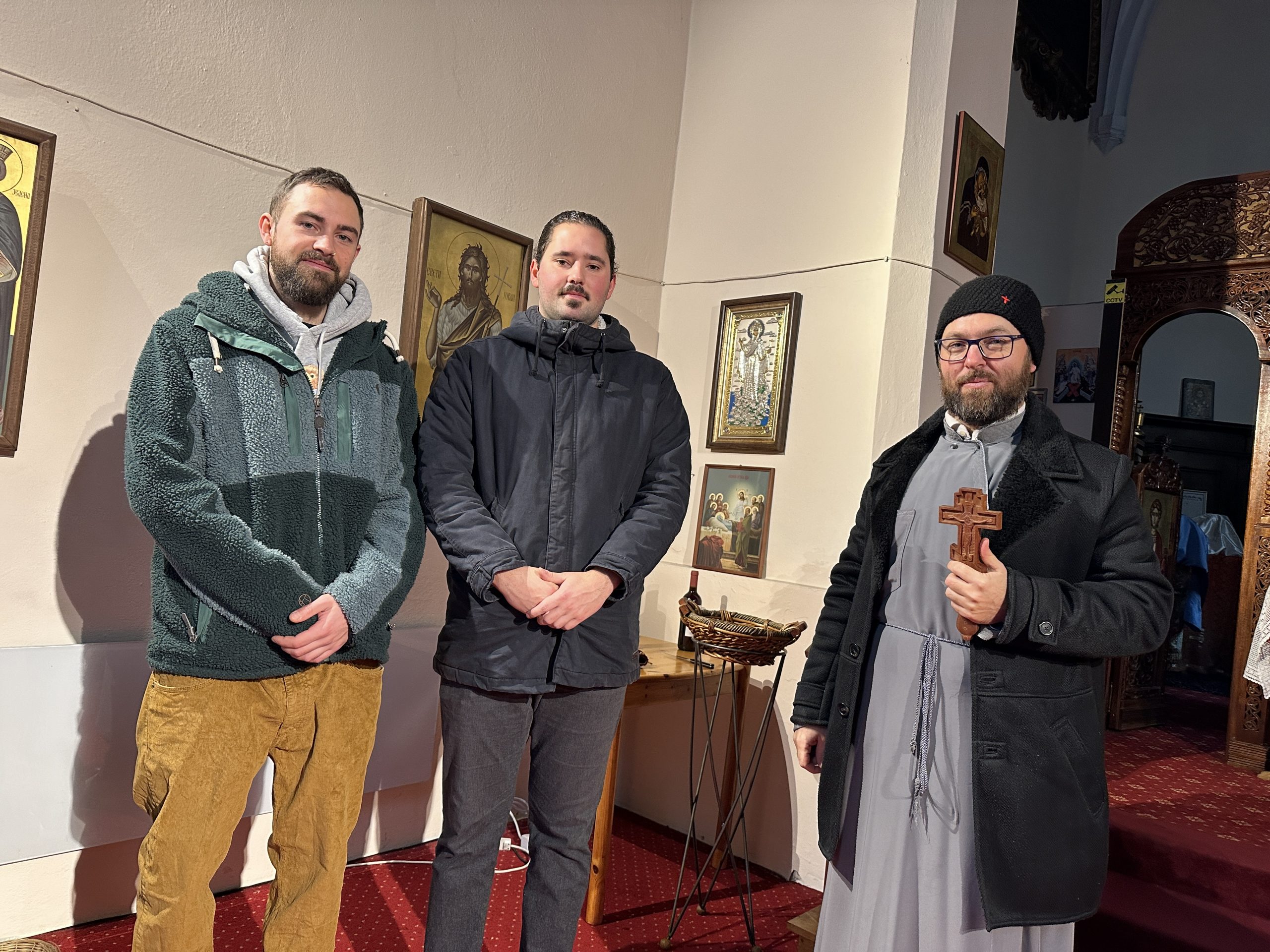 Priester Nikola Balović (rechts im Bild) mit Teodor und Konstantin Sikarac, zwei jungen Gemeindemitgliedern aus Feldkirch. ©VOL.AT/Mayer