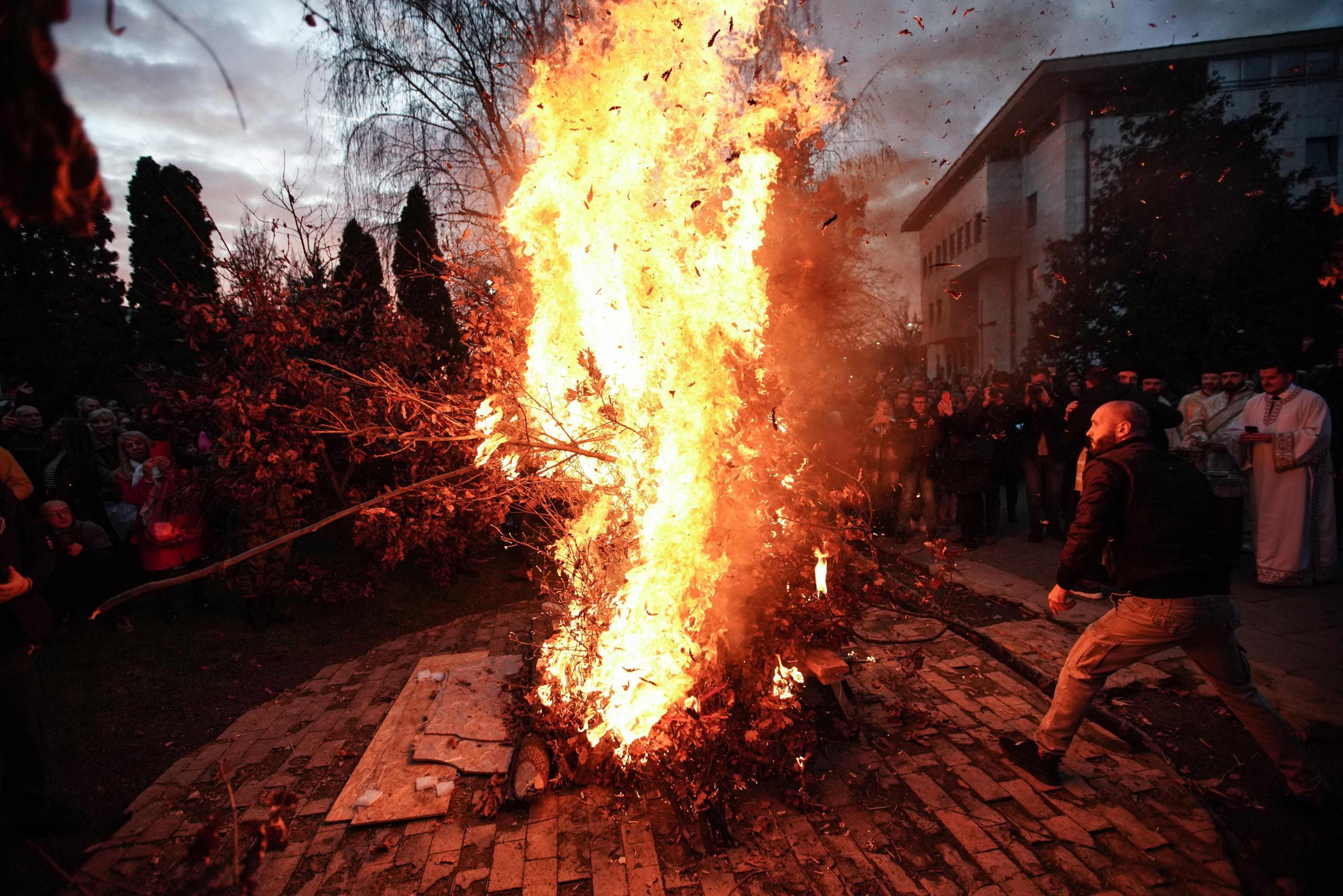 Ein Symbolbild zeigt das Verbrennen von Eichenzweigen vor einer Kirche in Serbien im Jahr 2023. ©OLIVER BUNIC / AFP