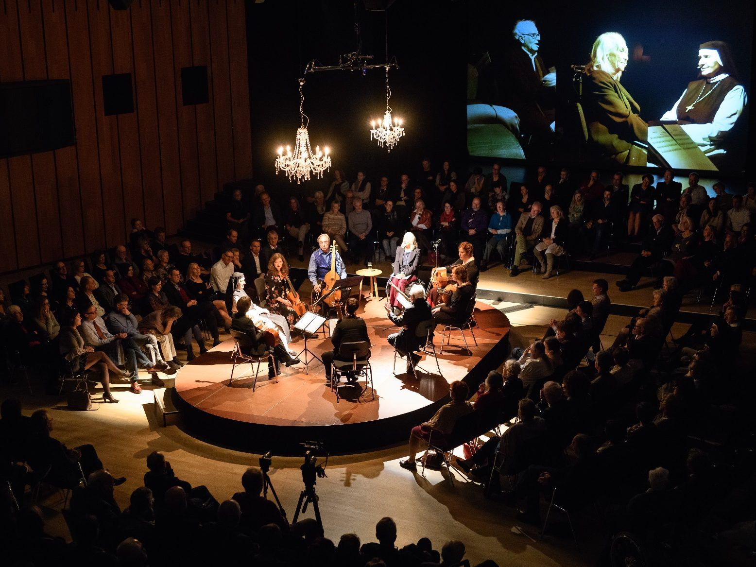 Unter dem Titel „Ich hab den Kampf gekämpft, den Lauf vollendet“ interpretierte das Ensemble Hathor Consort mit fünf Gambisten und einer Lautenistin Auszüge aus Dowlands Meisterwerk „Lachrimae – Sieben Tränen“. Dabei standen die Musiker im Dialog mit drei Forschenden der letzten Lebensphase, die über persönliche Erfahrungen und Erkenntnisse zu Versuch und Vergeblichkeit des Vollendens, Weisheit und Freiheit des Lebens vor dem Tod diskutierten.