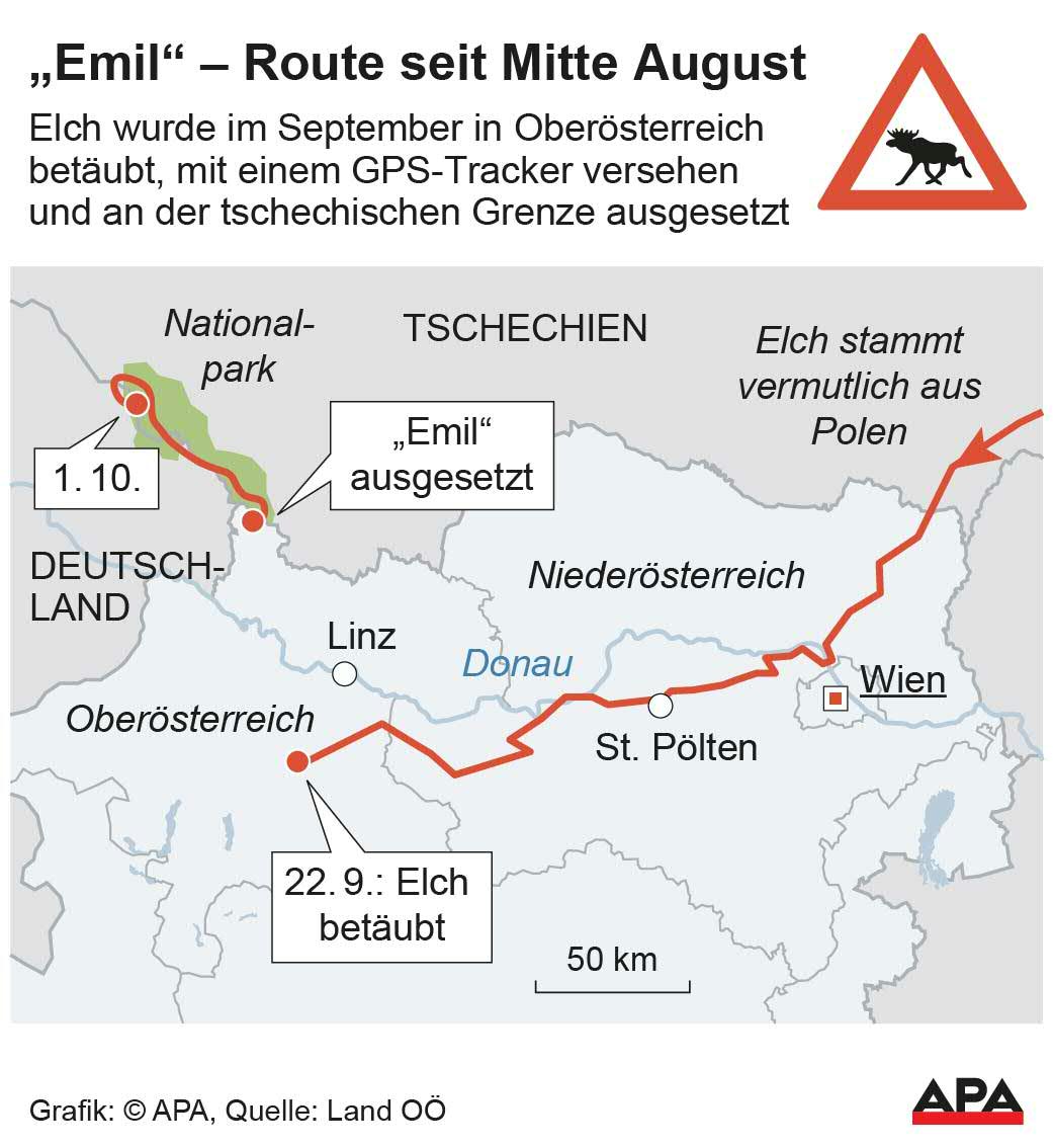 "Emil" was first sighted in Austria in mid-August, likely originating from Poland and entering the country via the Czech Republic. For more than a month, he wandered through Lower and Upper Austria before being stopped with a tranquilizer shot on September 22 - as he was about to enter the West Autobahn at the highway junction near Stattledt. The moose was brought to the Bohemian Forest at the tri-border area of Austria-Czech Republic-Germany and released. "Emil can now be a wild animal again - in the open nature, without roads, noise, and stress. This is good for him, as we can see," said Langer-Weninger.