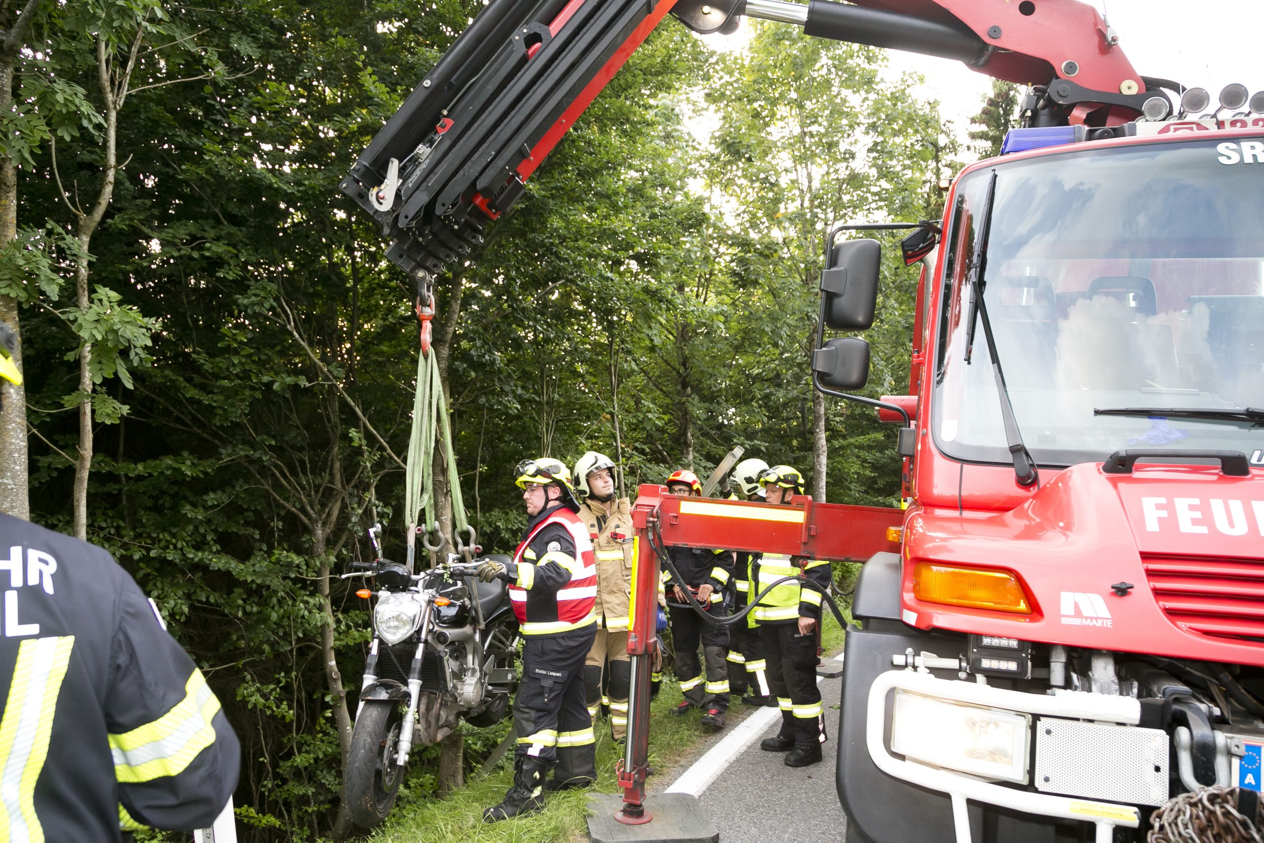 Per Kran des schweren Rüstfahrzeugs der Feuerwehr wurde das Motorrad geborgen.