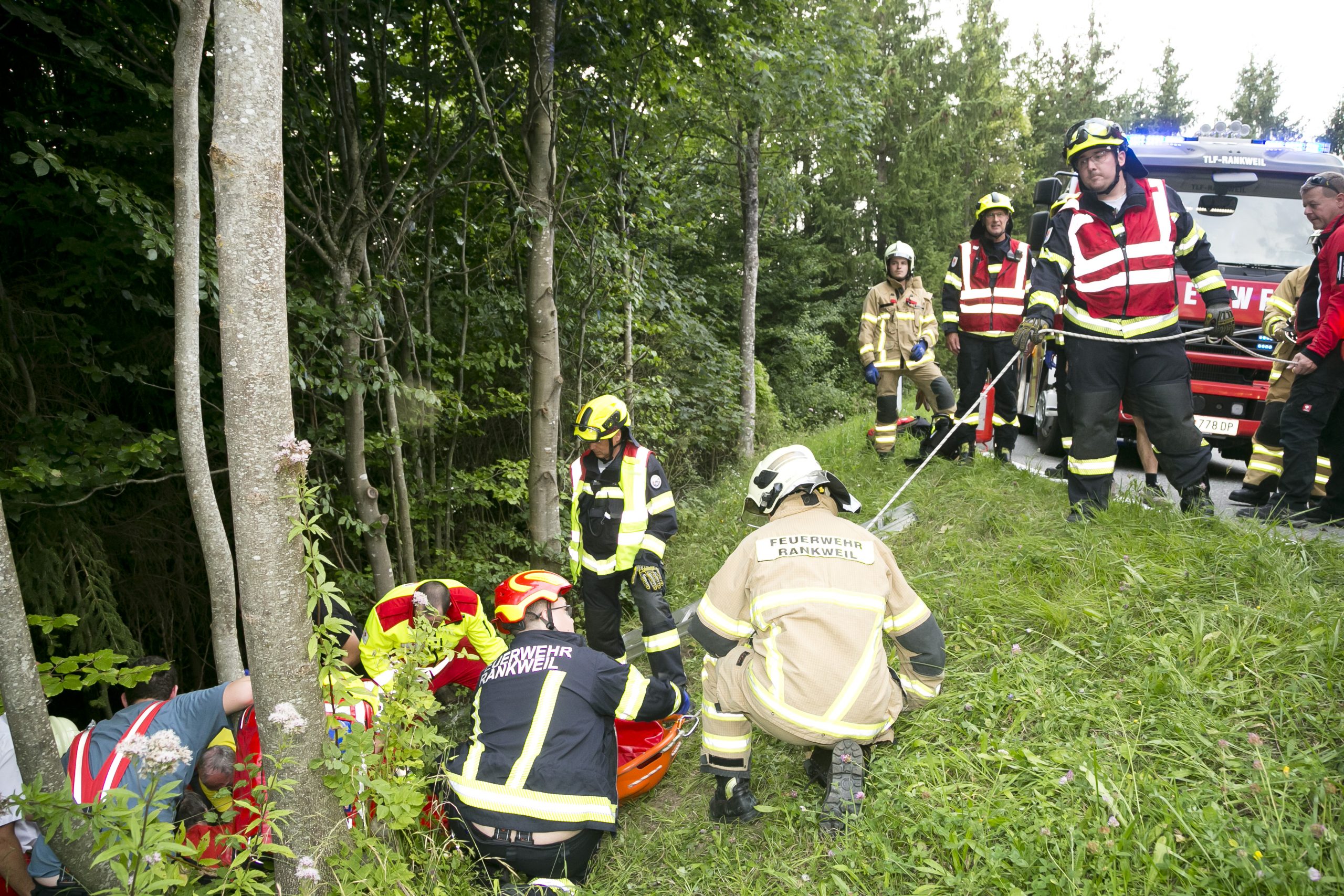 Feuerwehr Rankweil und Bergrettung unterstützten den Notarzt bei der Bergung. Der Mann wurde auf einer Trage mit Seilzug zurück auf die Straße gebracht und anschließend medizinisch versorgt.