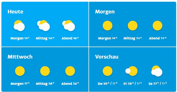 Der Mittwoch bringt von der Früh weg strahlenden Sonnenschein, begleitet von einem wolkenlosen Himmel am Vormittag. Am Nachmittag tauchen über den Bergen ein paar Quellwolken auf, jedoch bleibt die Wahrscheinlichkeit für Schauer und Gewitter gering. Es wird hochsommerlich warm, mit Tiefstwerten zwischen 11 und 15 Grad und Höchstwerten zwischen 26 und 30 Grad.