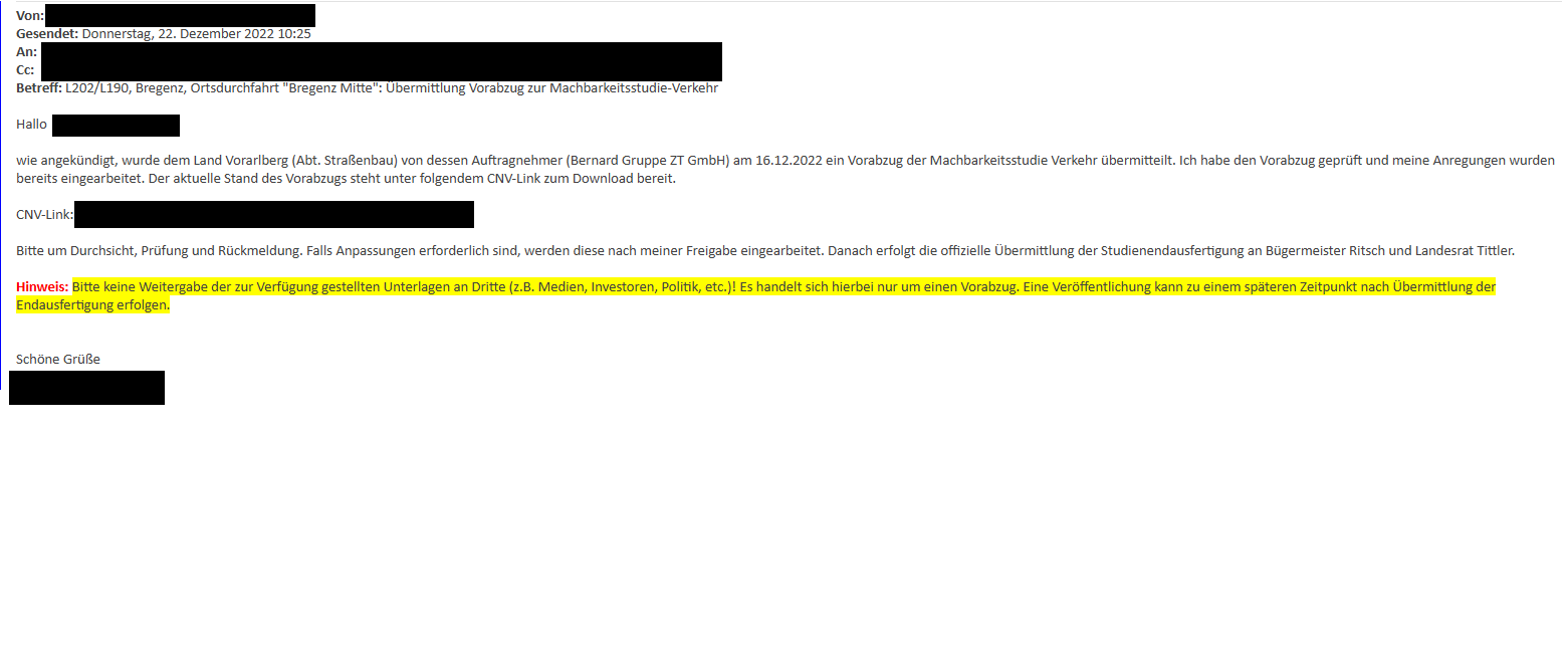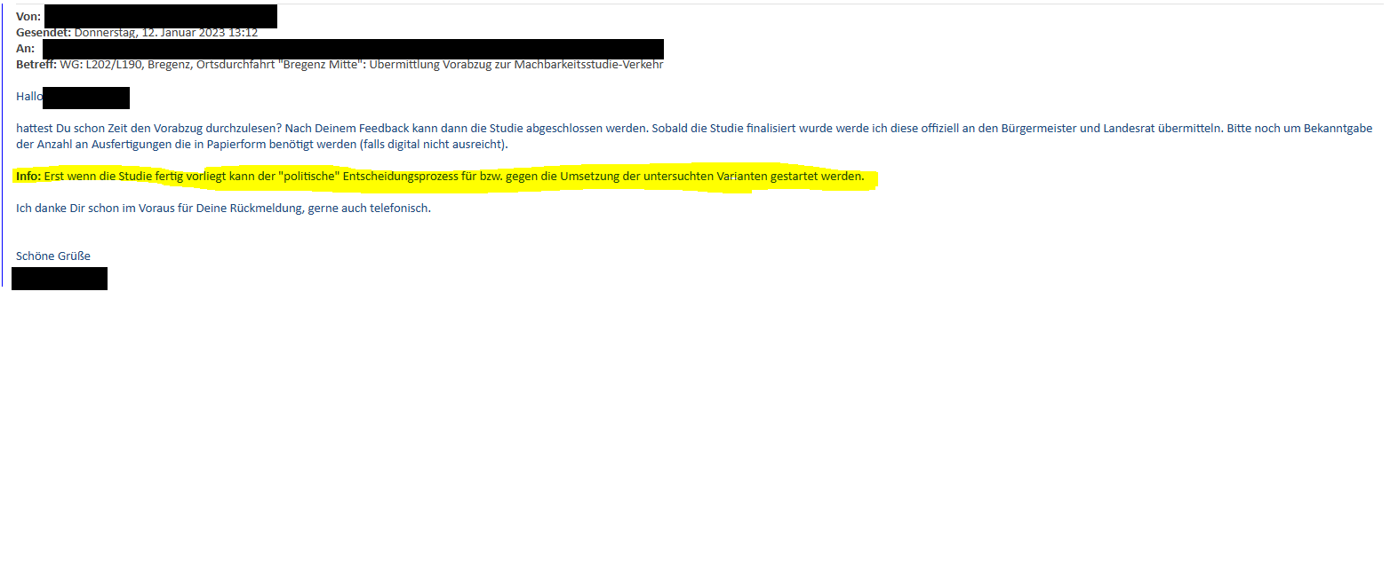 Wie vom Büro von Landesrat Tittler erwähnt, wurde der Vorabzug zur Machbarkeitsstudie-Verkehr am 22.12.2022 an die Landeshaupt Bregenz übermittelt. Die Ansicht, dass die grundsätzlichen Aussagen stehen würden und man die Studie der Stadtvertretung vorlegen hätte können, ist leider nicht richtig.