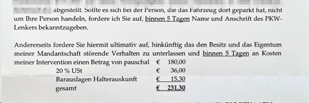 Nicht nur bei Lebensmittelmärkten kann das falsche Parken – etwa außerhalb der Öffnungszeiten – teuer werden. Auch bei der Sparkasse im Dornbirner Rohrbach kann dies der Fall sein. Ein VOL.AT-Leser berichtete, er sei hier kürzlich in die "Parkplatzfalle" getappt. "Zwei Minuten geparkt und am Bankomat Geld herausgelassen", meint er. Daraufhin erhielt er ein Anwaltsschreiben und muss 231,30 Euro zahlen.