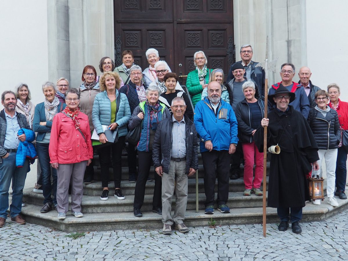 Nachtwächter Mag. Harald Pfanner erwartete uns in mittelalterlicher Kleidung samt Hellebarde und Laterne auf dem Vorplatz des Doms, wo er uns das Denkmal von Georg Joachim Rheticus erklärte. Weiter ging es zur Neustadt, vorbei am Rathaus mit einem Blick auf die Nord-Fassade mit der Darstellung von Graf Rudolf V mit dem Freiheitsbrief. Vom ehemaligen Stadtarchiv aus entdeckten wir gut erhaltene mittelalterliche Fassaden. Durch die enge Entenbach- und Rosengasse kamen wir zur Conan Doyle-Gasse, nach dem britischen Autor der Sherlock Holmes Abenteuer, der u.a. das Gymnasium „Stella Matutina“ besuchte. Beeindruckend war der Besuch im imposanten Stadtvertretungssaal im Rathaus. Große Beachtung fand das „Palais Liechtenstein“, von Fürst Hans Adam von Liechtenstein im 17 Jh. als barockes Amtshaus errichtet, später Brauerei, Gasthaus, Spinnerei und Wohnhaus und heute im Besitz der Stadt Feldkirch. Es folgten Erklärungen zum Katzenturm, zum Churertor, zur ältesten Apotheke, zur Marktgasse und zur Johanniterkirche. Zwischendurch erzählte Harald Pfanner lustig-schaurige Geschichten aus jener Zeit. Die humorvolle und spannende Führung klang im Rösslepark bei einem gemütlichen Hock aus.
