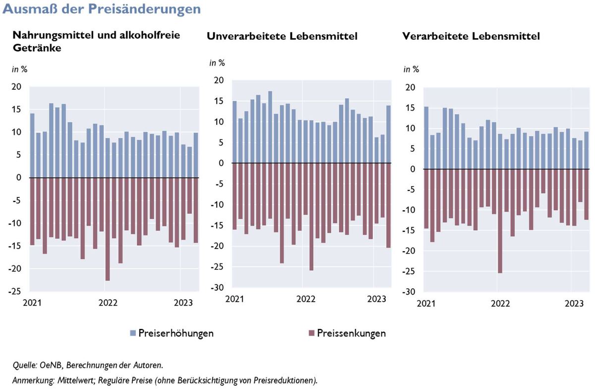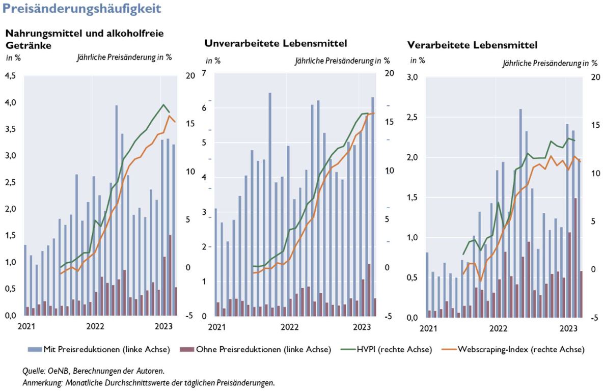 Angesichts der aktuellen Inflationsentwicklung stellte sich die OeNB die Frage, ob sich das Preissetzungsverhalten der Unternehmen in Zeiten hoher Inflation fundamental verändert hat. Eine auf Preisdaten aus dem Onlinehandel beruhende Analyse deutet darauf hin, dass es im Nahrungsmittelsektor im Hochinflationszeitraum (ab Jänner 2022) häufiger zu Preisänderungen kam als davor. Die Preise für Nahrungsmittel und alkoholfreie Getränke wurden um bis zu dreimal häufiger verändert.