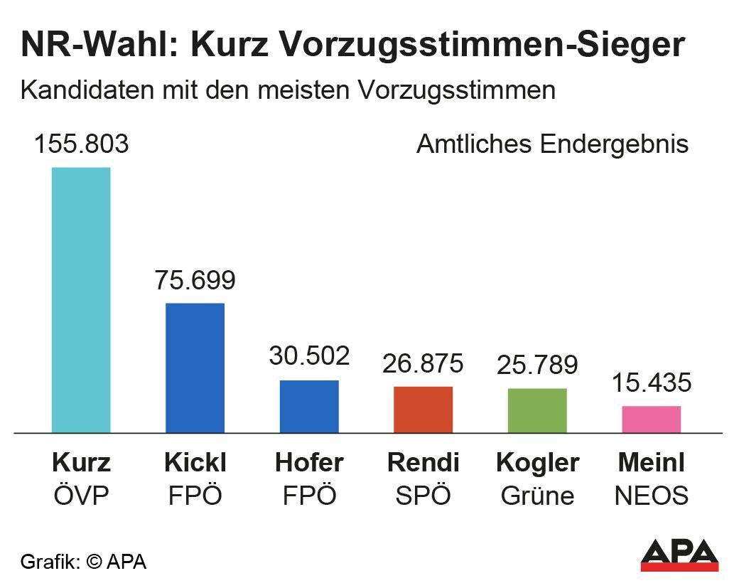 ÖVP-Chef Sebastian Kurz hat auch heuer - wie 2017 - bei weitem die meisten Vorzugsstimmen der Bundeslisten-Kandidaten erhalten. Laut dem am Mittwoch veröffentlichten amtlichen Endergebnis kam Kurz auf 155.803 Nennungen. FPÖ-Listenzweiter Herbert Kickl erhielt 75.699 und überflügelte damit FPÖ-Chef Norbert Hofer deutlich. Dieser kam auf 30.502 "persönliche" Stimmen.