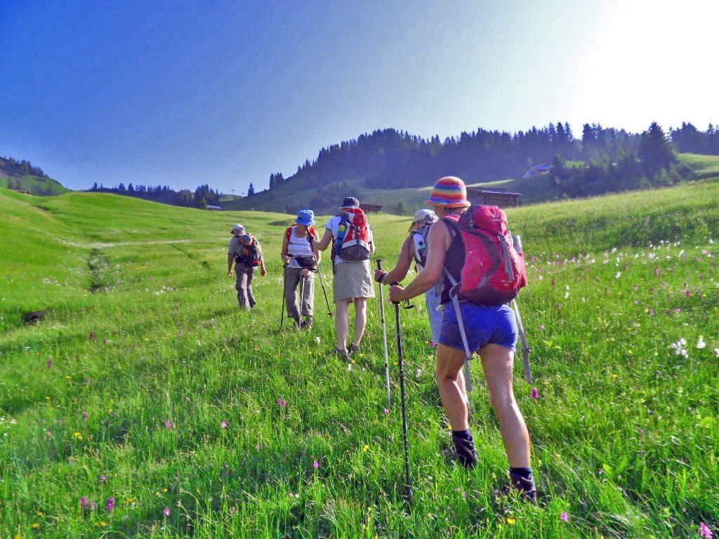 Ein feiner Rückenwind erleichterte den Anstieg ungemein. Während der ersten Trinkpause hatte ein Teilnehmer nochmal einen kurzen Ab- und Aufstieg zu bewältigen, weil er unterwegs, beim Fotografieren, sein Hemd vergessen hatte. Danach ging es planmäßig weiter zum Hochblanken, 2068 m, dann zum Ragazer Blanken, 2051 m, weiter zur Sünser Spitze, 2062 m. Von dort hinab zum Sünsersee, wo die Gruppe einen erfrischenden Badeaufenthalt mit Jause einlegte. Es folgte ein letzter Anstieg zum Sünser Joch, um von dort ins Tal zu gelangen. Auf der ganzen Strecke bot sich den Wanderlustigen eine farbenreiche, vielseitige Blumenpracht, die die Herzen höher schlagen ließ, und es erfolgte ein reger Austausch über die Namen der Blumen und Wirkungen vieler Kräuter.