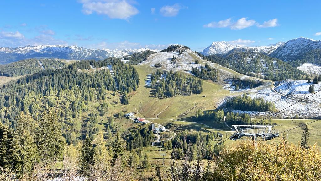Dann geht es auch schon zu unserem Tagesausflugsziel, dem zweiten großen Programmpunkt: Mit der Gondelbahn auf den Geisterberg! Das ganze Wochenende lang sind uns die Wettergötter absolut wohlgesonnen, weshalb wir dieses Abenteuer in vollen Zügen genießen können. Die Kinder erhalten schon bei der Bergstation in St. Johann Alpendorf ein liebevoll gestaltetes "Geistermedaillon" und jede Menge Sticker, mit denen die Schnitzeljagd am Berg, begleitet von den Geister-Maskottchen "Gspensti und Spuki" beginnen kann. Auf den Spuren von Feuer-, Wasser-, Erd- und Luftgeistern geht es über Stock und Steine, durch Wald und Wiese, und selbst nicht gehfreudige Kinder werden von den vielen liebevoll gestalteten Figuren, die es hier zu entdecken gibt, und der Aussicht auf eine Überraschung, die mit dem gänzlich richtig beklebten Amulett am Ende wartet, zum Weiterwandern motiviert. Dass hier sogar Schnee liegt, fasziniert die beiden Buben besonders.