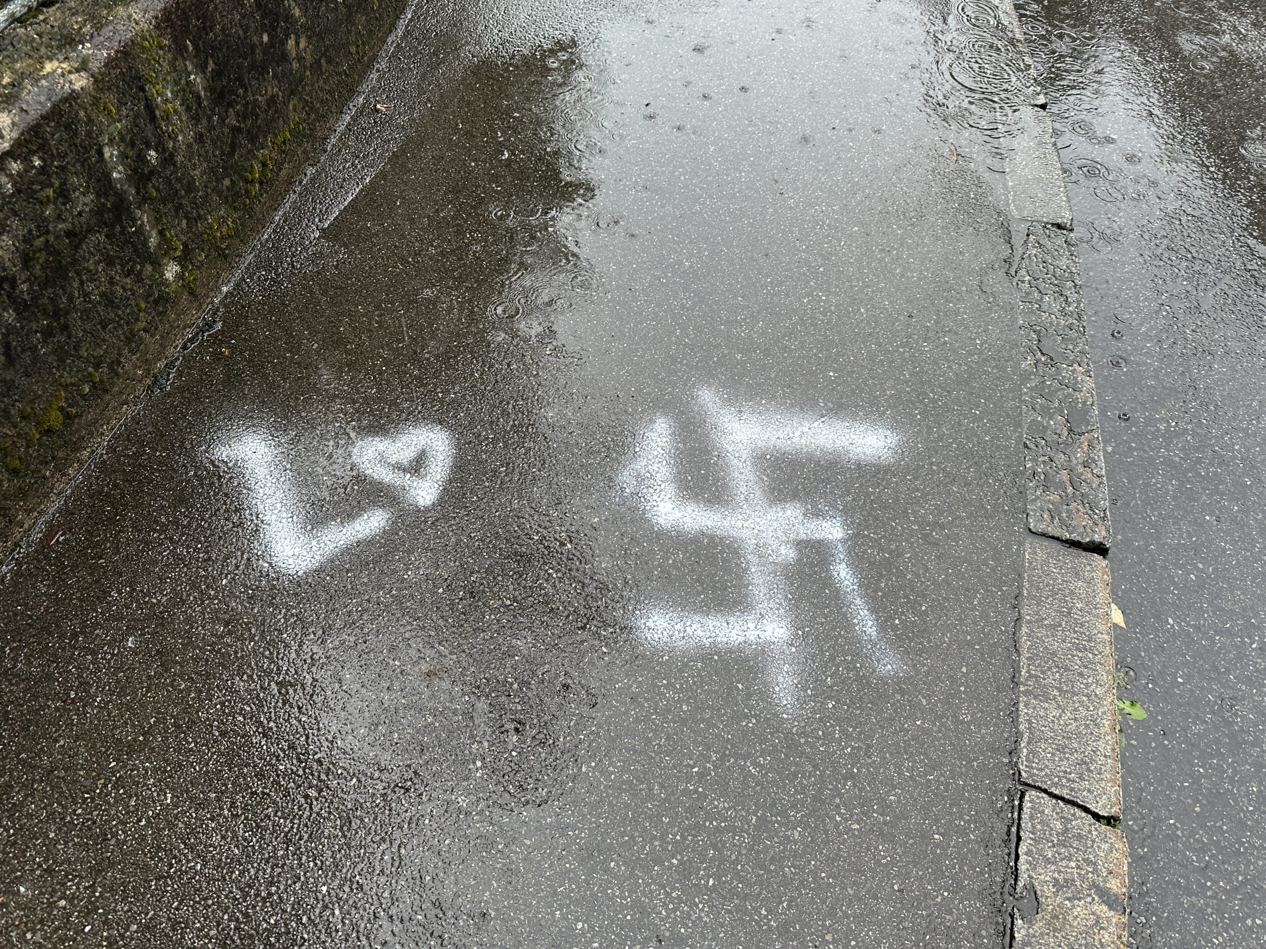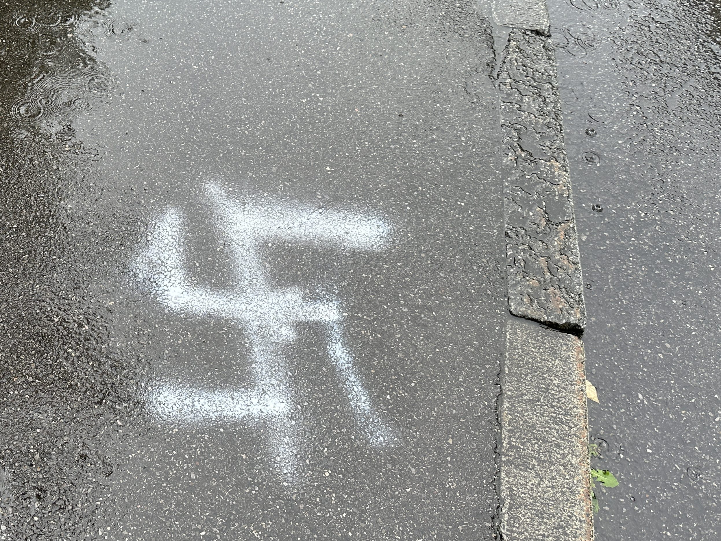 Ein Hakenkreuz prangt auf dem Gehweg – gesprüht mit weißer Farbe, nur wenige Meter von der Jugendarbeit und dem Sozialprojekt Kaplan Bonetti entfernt.
