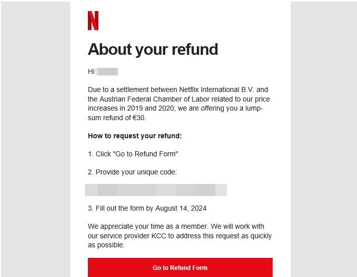 Allen Netflix-Konsumenten, die das Angebot zur einvernehmlichen Bereinigung annehmen, bringt dies eine rasche Rückerstattung ohne bürokratischen Aufwand. Sie müssen keine proaktiven Schritte unternehmen, sondern lediglich Ausschau nach dem Rückerstattungsangebot von Netflix in ihrem Mail-Postfach halten.