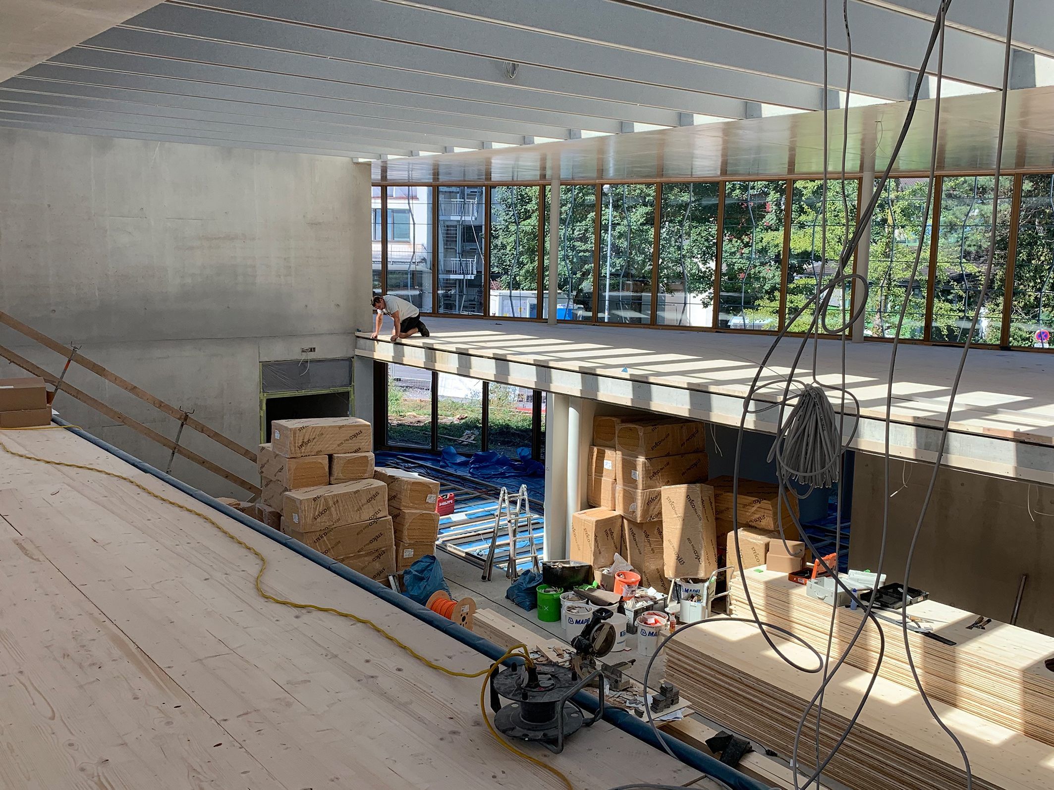 Im Inneren des neuen Gebäudes erfolgt bereits der Aufbau der Fußböden nachdem die Installationen großteils fertiggestellt sind. Anschließend werden die Tischlerarbeiten folgen.