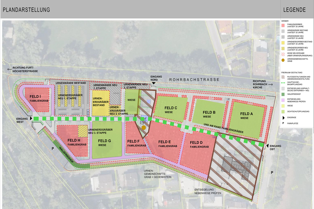 Im Bereich der alten Urnenwände im Westeingangsbereich werden 16 schmalkronige Wildbirnen gepflanzt, um den Bereich zu verschönern und ein einheitliches Erscheinungsbild zu schaffen. Auch hier werden neue Sitzmöglichkeiten geschaffen. Die Neugestaltung des Friedhofs Rohrbach wird dazu beitragen, dass der Friedhof als Ruhestätte und zugleich als Grünraum mit hoher Aufenthaltsqualität wahrgenommen wird.