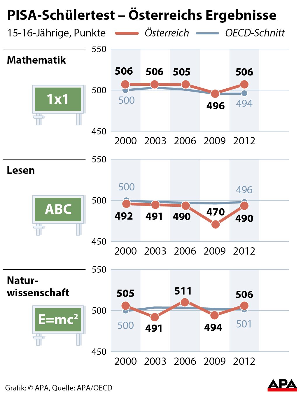 Aus Österreich nahmen rund 7.000 Schüler aus ca. 270 Schulen teil. Das sind knapp zehn Prozent des Altersjahrgangs. Haupttestgebiet waren diesmal die Naturwissenschaften – das bedeutet, dass mehr als die Hälfte der Fragen aus diesem Bereich kamen. Bei PISA 2012 lagen die Ergebnisse der 15- bis 16-jährigen Österreicher in der Mathematik signifikant über, in den Naturwissenschaften im OECD-Schnitt und im Lesen darunter.