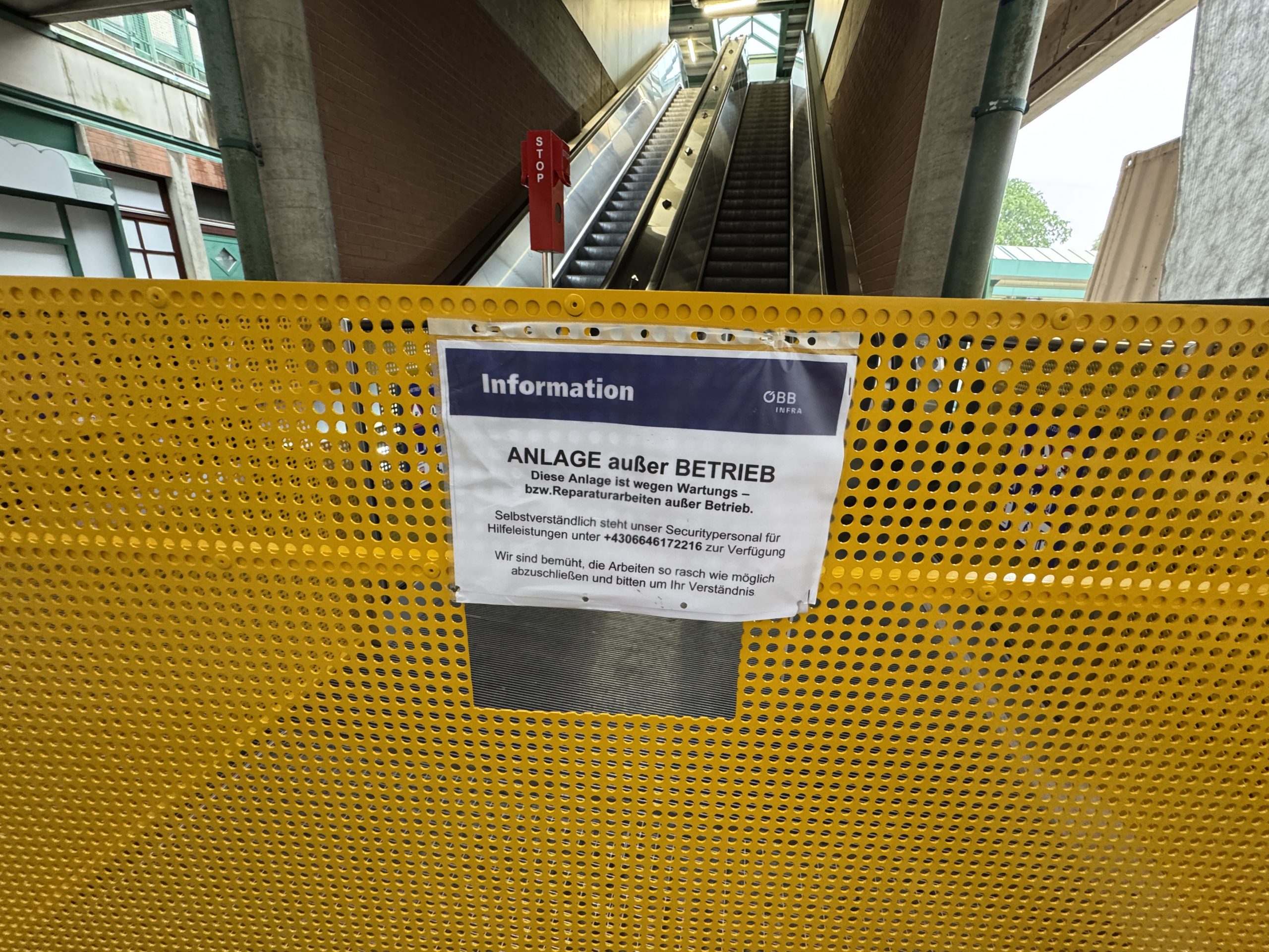 Am Wochenende kam der erste Hinweis, am Montagvormittag war die Situation unverändert: Die rechte Rolltreppe vom Haupteingang beim Bäckerwagen in Richtung Bahnsteige funktionierte nicht. Ein gelber Zaun blockierte den Zugang, ein Zettel der ÖBB verwies auf „Wartungs- bzw. Reparaturarbeiten“.