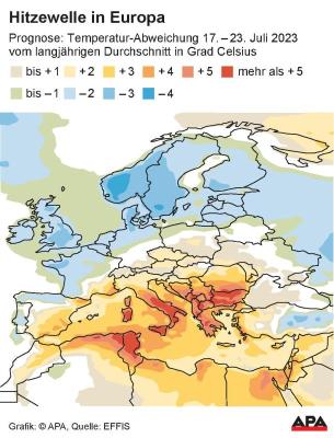 Währen Österreich mit unwetterträchtigen Gewittern zu kämpfen hat, ist in weiten Teilen des Mittelmeerraums eine Rekord-Hitzewelle in vollem Gange. Besonders betroffen sind dabei Südostspanien, Italien und Griechenland. Hier sind momentan Höchstwerte zwischen 35 und 45 Grad an der Tagesordnung. Der Höhepunkt ist dabei zwischen Dienstag und Mittwoch zu erwarten. In Rom sind zum Beispiel rekordverdächtige 41 Grad in Reichweite und sogar der Europa-Hitze-Rekord von 48,8 Grad (aufgestellt im August 2021 auf Sizilien) könnte zwischen Süditalien und Griechenland ins Wanken geraten. Aus jetziger Sicht sollte es zudem mindestens noch eine gute Woche dauern, bis sich die Temperaturen in diesen Regionen wieder den jahreszeitlichen Durchschnitt nähern.