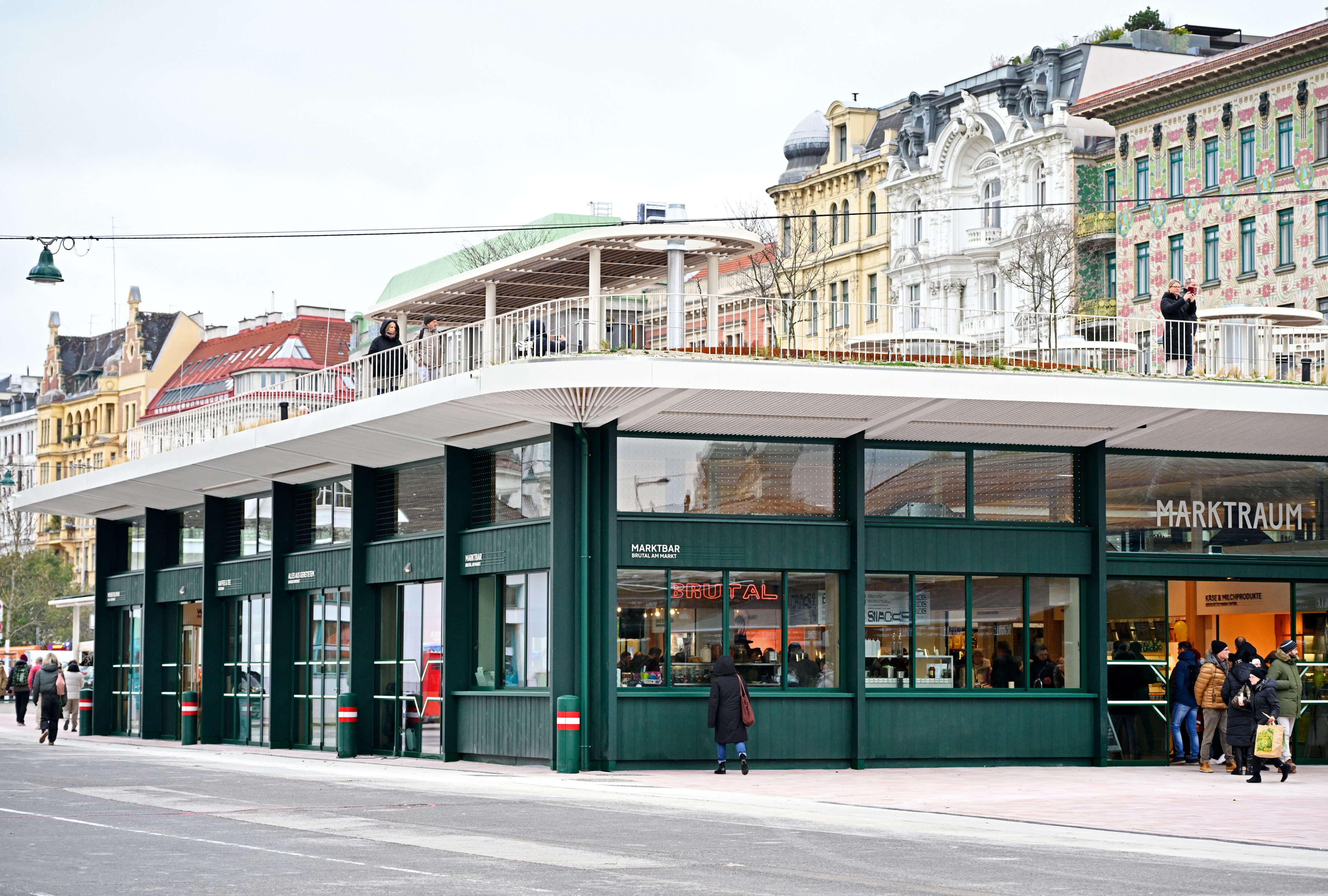 Construction on the new market hall at the Vienna Naschmarkt took about a year, primarily using wood and glass. The new Naschmarkt entrance is significantly larger than the existing stalls but is stylistically aligned with them. Overall, the new hall covers an area of about 850 square meters.