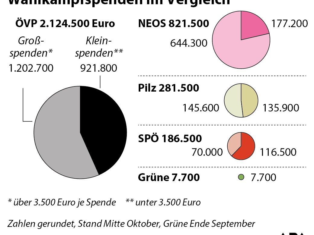 15.10.2017 Insgesamt 3,4 Millionen Euro haben die Parteien im Wahlkampf 2017 gemeldet, fast zwei Drittel der Einnahmen verzeichnete dabei die ÖVP unter Sebastian Kurz, die NEOS ein Viertel.