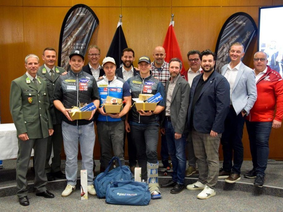 7.03.2025 Landesrat Gantner und Bürgermeister Tschann gratulierten Thomas Steu, Jonas Müller und Yannick Müller.
