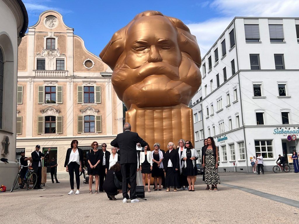 14.07.2025 Die monumentale Skulptur „Karl Marx Light“ von Hannes Langeder stand kurz am Kornmarktplatz.