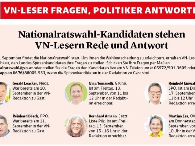 13.09.2019 Schwarzach Heute geht die VN-Aktion „Leser fragen, Politiker antworten“ zur Nationalratswahl in die nächste Runde. Von 11 bis 12 Uhr ist die Grünen-Spitzenkandidatin auf der Landesliste, Nina Tomaselli, in der VN-Redaktion zu Gast, von 15 bis 16 Uhr Bernhard Amann, Spitzenkandidat von Jetzt – Liste Pilz. Sie beantworten heute die Fragen der VN-Leser. Möglichkeiten, Fragen