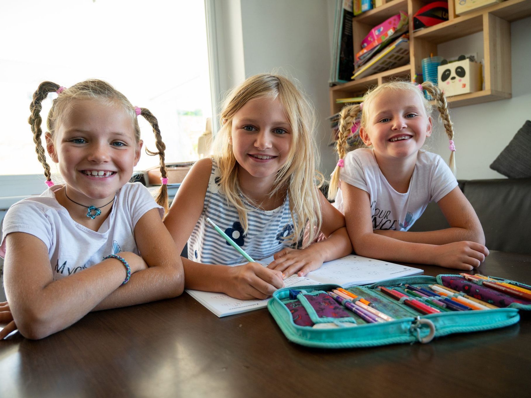 12.09.2021 Amelie (8) und ihre Zwillingsschwestern Lisa und Hanna (6) freuen sich auf den Schulbeginn.