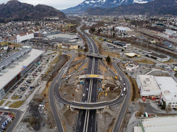 22.02.2020 Neuer Autobahnanschluss Bludenz-Bürs nimmt allmählich Form an. Kreisverkehr über die A 14 beinahe geschlossen.