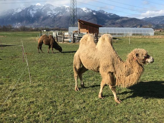 19.02.2020 Vier Kamele grasen derzeit unweit der Landesstraße im Rankweiler Weitried.