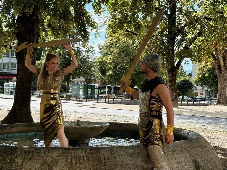 8.08.2023 Das Ensemble unpop ist mit ihrer jüngsten theatralen Intervention „Die Politiker“ öffentlich unter freiem Himmel zu erleben.