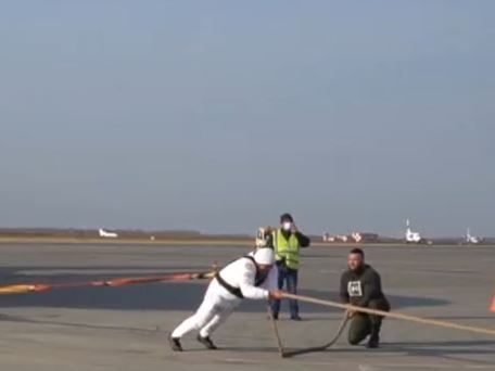8.11.2020 Ein 46-jähriger Russe zog eine 36-Tonnen-Boeing 737-500 in einer Rekordzeit von 44,58 Sekunden über eine Distanz von 25 Metern