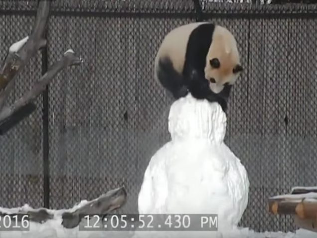 4.12.2017 Die "Giant Panda Cam" des Zoos in Toronto nahm den Panda namens Da Mao dabei auf, wie er mit einem Schneemann spielt, den die Tierpfleger für ihn gebaut haben. Mehrmals versucht der Panda auf den Schneemann zu klettern, fällt dabei aber jedes Mal hinunter.