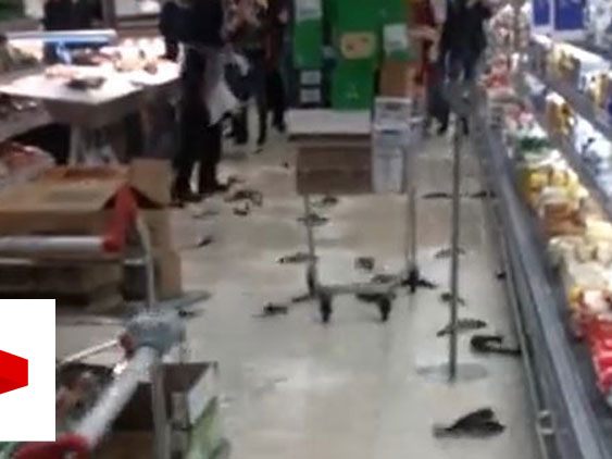 7.02.2018 Dieser Supermarkt wurde nicht überflutet und die Fische hereingeschwemmt. Ein großes Aquarium für Frischfisch war gebrochen.