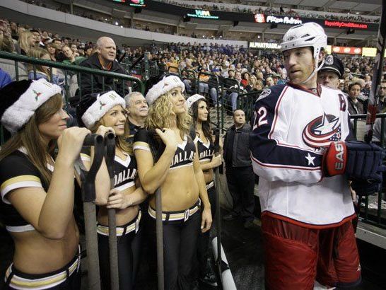 Columbus Blue Jackets Verteidiger Mike Commodore wirft einen genauen Blick auf die Ice Girls der Dallas Stars.