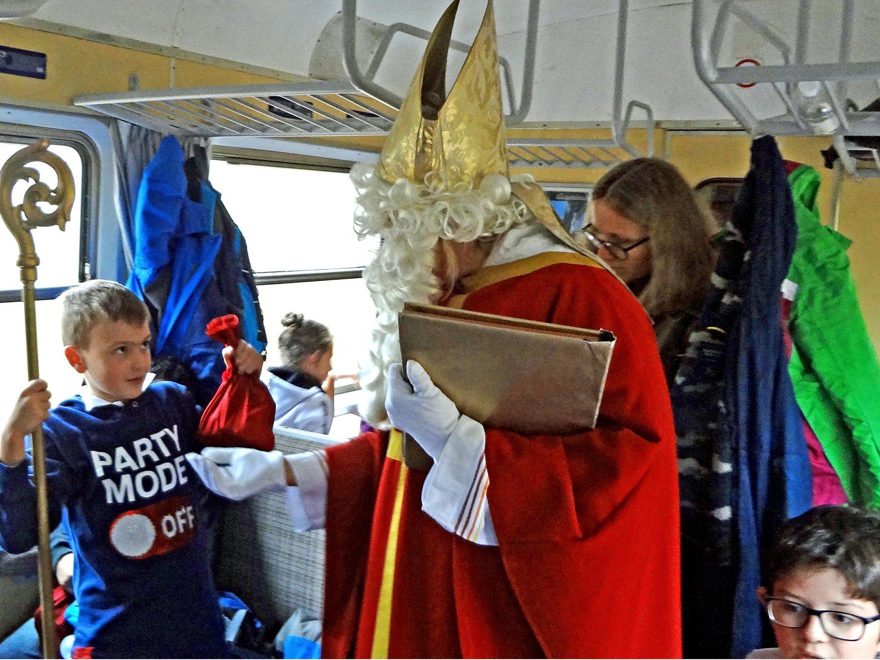 Pünktlich zu Schulbeginn marschierten alle Klassen gemeinsam mit ihren Klassenlehrerinnen und ein paar Begleitpersonen zum Bahnhof Bludenz. Von dort ging es mit dem Zug nach Dornbirn, wo bereits drei Sonderbusse auf die Kinder warteten. Voller Vorfreude endlich in Bezau angekommen, durften die Kinder in den einzelnen Waggons platz nehmen. Leider meinte es Frau Holle nicht besonders gut, was jedoch die Stimmung nicht trübte. Auf halber Strecke tauchten dann plötzlich der Nikolaus und sein Gehilfe aus dem Wald auf und stiegen zu den Kindern in den Zug. Es wurden Gedichte aufgesagt, Lieder gesungen und zur Belohnung gab es dann für jedes Kind ein Säckchen mit gefüllten Leckereien. Auch heuer gilt ein besonderer Dank den zahlreichen Spendern sowie dem Elternverein, die die Kosten der Fahrt übernommen und die Nikolaussäckchen bereitgestellt haben.