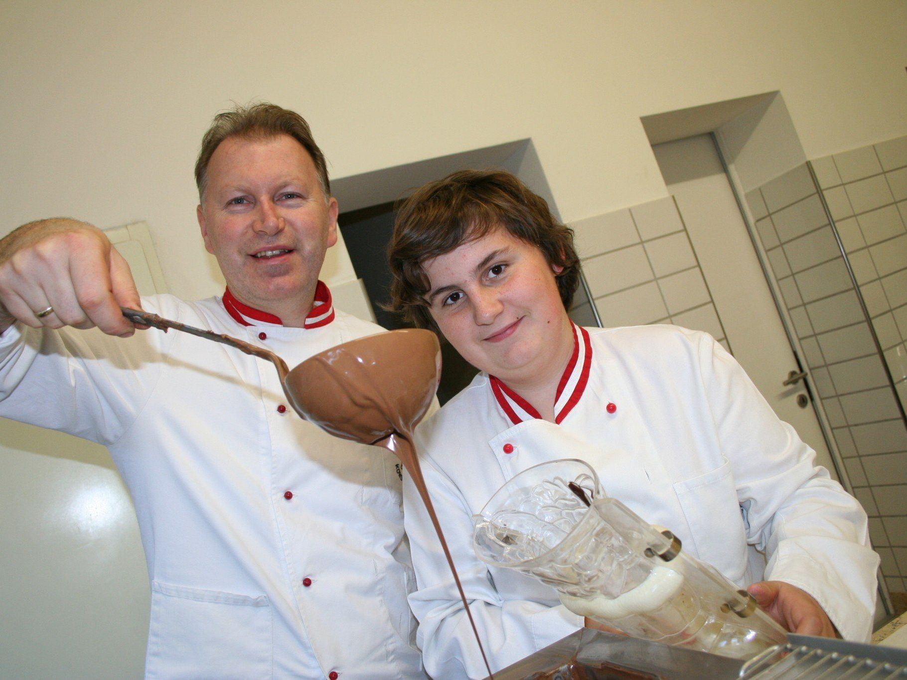 Verwendet werden dabei Schokoladechips, „da diese sowohl einfacher zum Portionieren als auch leichter zum Schmelzen sind”, so der Konditormeister. Die Schokolade wird erst auf 32 Grad erhitzt, „damit der Kakaobutter nicht aufschwimmt, und es dadurch später nicht zu einer gräulichen Verfärbung kommt.” Für den Gießvorgang wird die Kuvertüre danach auf 25 Grad heruntergekühlt.
