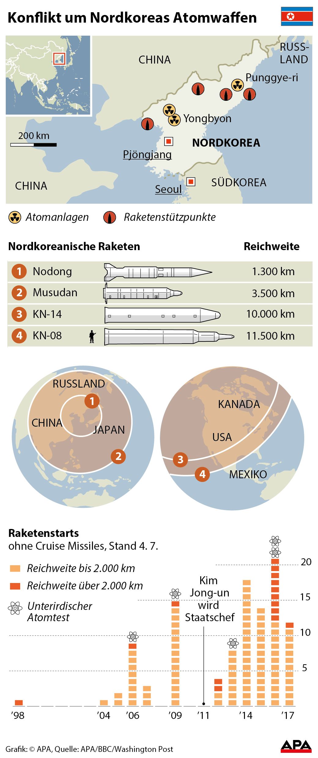 Trotz aller Verbote des UN-Sicherheitsrates sowie aller Warnungen hatte Nordkorea am 28. Juli eine Interkontinentalrakete getestet. Diese hatte nach Berechnungen von Experten eine theoretische Reichweite von rund 10.000 Kilometern. Als Reaktion auf den Raketentest verhängte der UN-Sicherheitsrat am Wochenende die bisher schärfsten Wirtschaftssanktionen gegen Nordkorea.