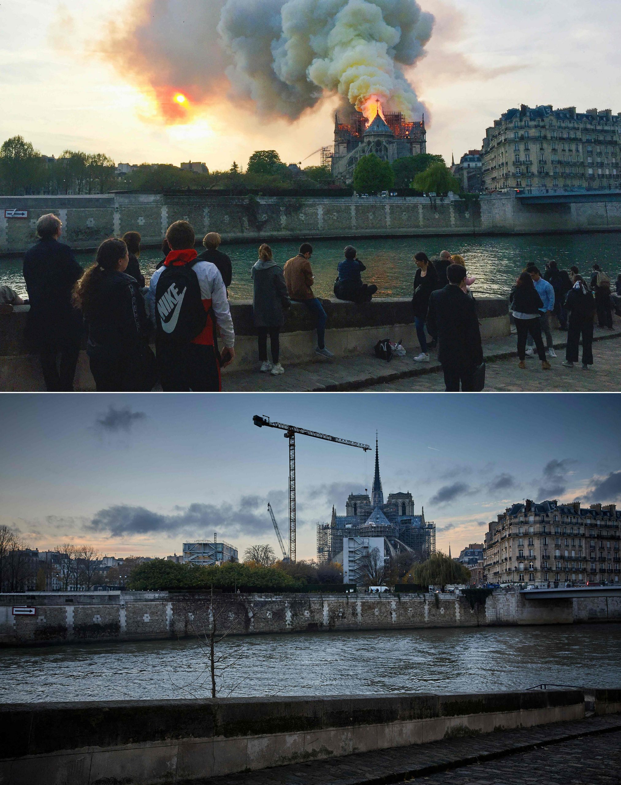Am 15. April 2019 ertönte um 18.20 Uhr, nach dem Beginn eines Gottesdiensts, der erste Feueralarm. Die Gläubigen mussten aus dem Gebäude, durften aber wieder zurück, denn es war nichts von einem Feuer zu sehen. Wenige Minuten später, um 18.43 Uhr, ging der Alarm erneut los. Die Kirche wurde geräumt. Gegen 19.50 Uhr stürzte der Spitzturm in sich zusammen. Ein dramatischer Moment, der weltweit auf Bildschirme übertragen wurde. Zum Glück wurde bei dem Unglück niemand ernsthaft verletzt.