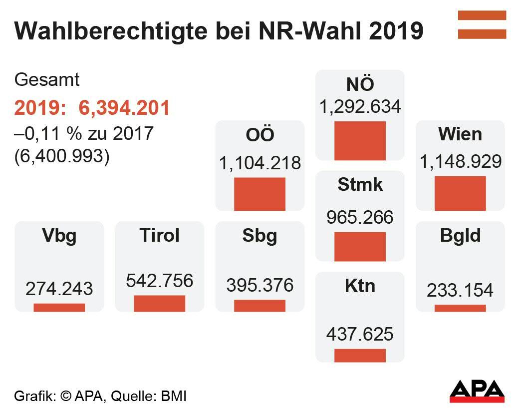 Die seit 1945 - bisher mit nur zwei Ausnahmen - beständig wachsende Zahl der Wahlberechtigten ist heuer erstmals seit 1995 leicht geschrumpft. 2017 waren es noch 6,400.993, heuer sind es (vorläufig) 6,394.201 - das sind um 6.792 bzw. 0,11 Prozent weniger. Ein Minus verzeichneten Kärnten, Wien und die Steiermark, Vorarlberg und Niederösterreich legten etwas zu.