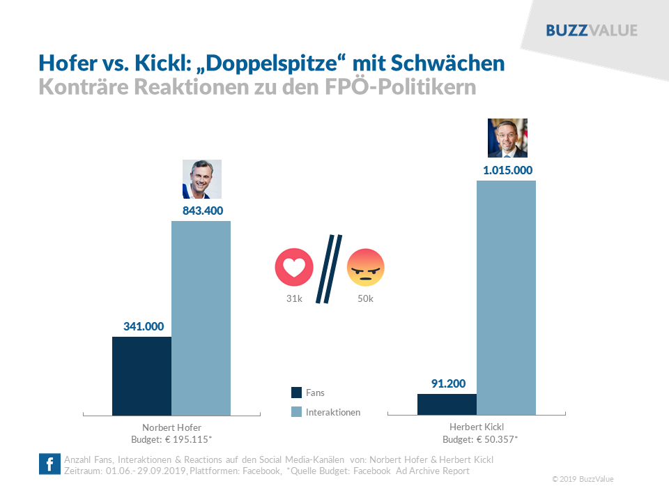 Der Spitzenkandidat der FPÖ, Norbert Hofer, konnte im Laufe des Wahlkampfes zwar ebenso beachtliche Interaktionszahlen (1 Mio.) verzeichnen, schaffte es schlussendlich jedoch weder im Social Web noch bei der Wahl die früheren Sphären von HC Strache zu erreichen. Auch Hofer setzte auf Facebook ein hohes Werbebudget (€ 195.100) ein, um seine Reichweiten zu steigern. Aber trotzdem blieb er in seiner Social Media-Performance nicht nur hinter Strache, sondern auch der zweite FPÖ-Spitzenkandidat, Herbert Kickl, erzielte auf Facebook & Co im Laufe des Wahlkampfes höhere Interaktionen, und das bei deutlich geringerem Budgeteinsatz (€ 50.400).